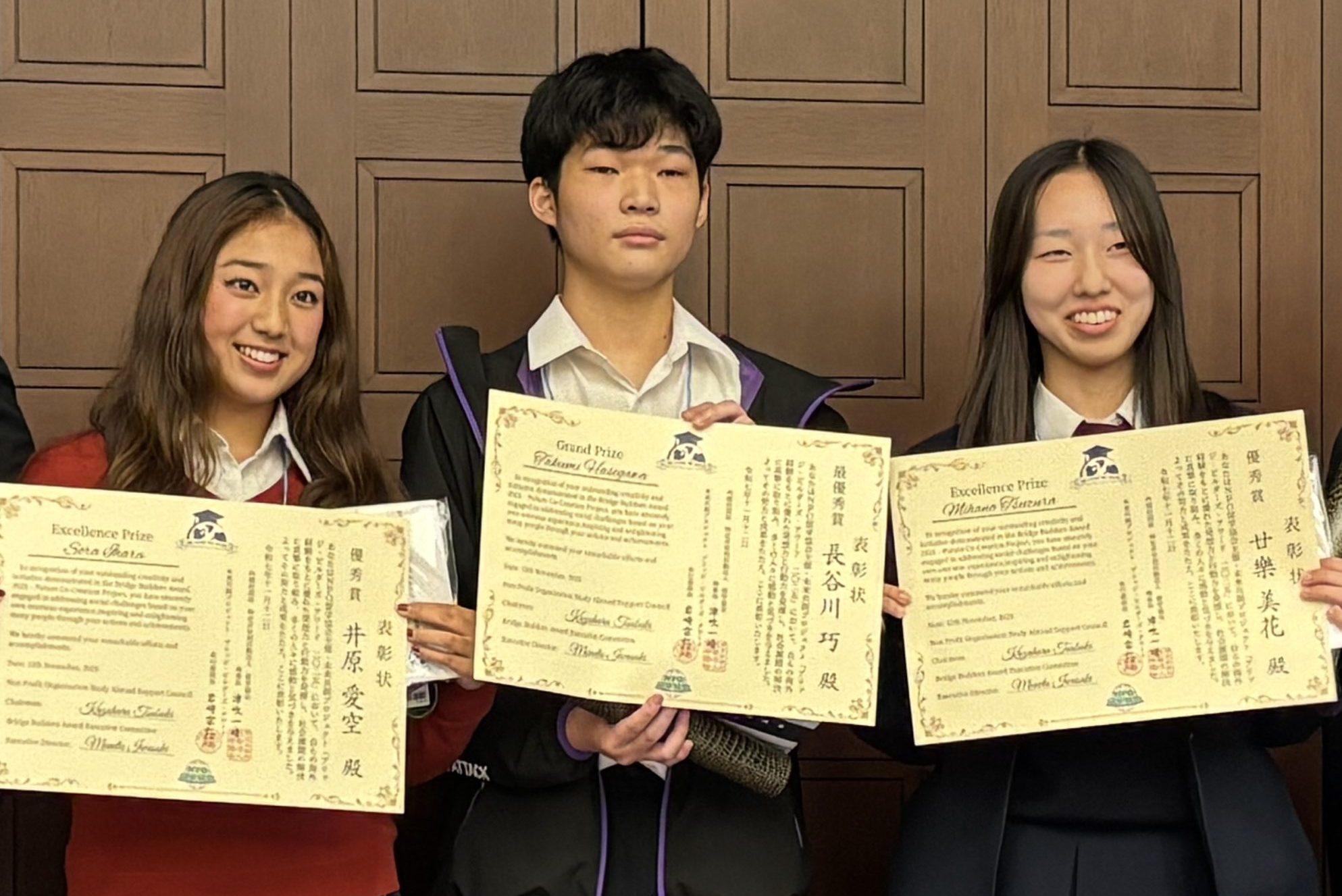 去る11月12日、明治大学・宮城浩蔵ホールにて授賞式を執り行いました。各国大使館をはじめ、多くの大学・高校・教育関係者の皆さまにご臨席いただき、和やかな雰囲気の中にも大きな期待と祝福に満ちた式典となりました。受賞者による堂々としたスピーチには、会場から大きな拍手が送られました。